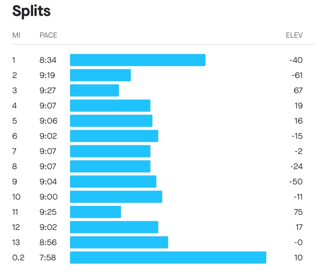 For context, here are the splits of my longest training run…there was a bit of speed work but not a ton.