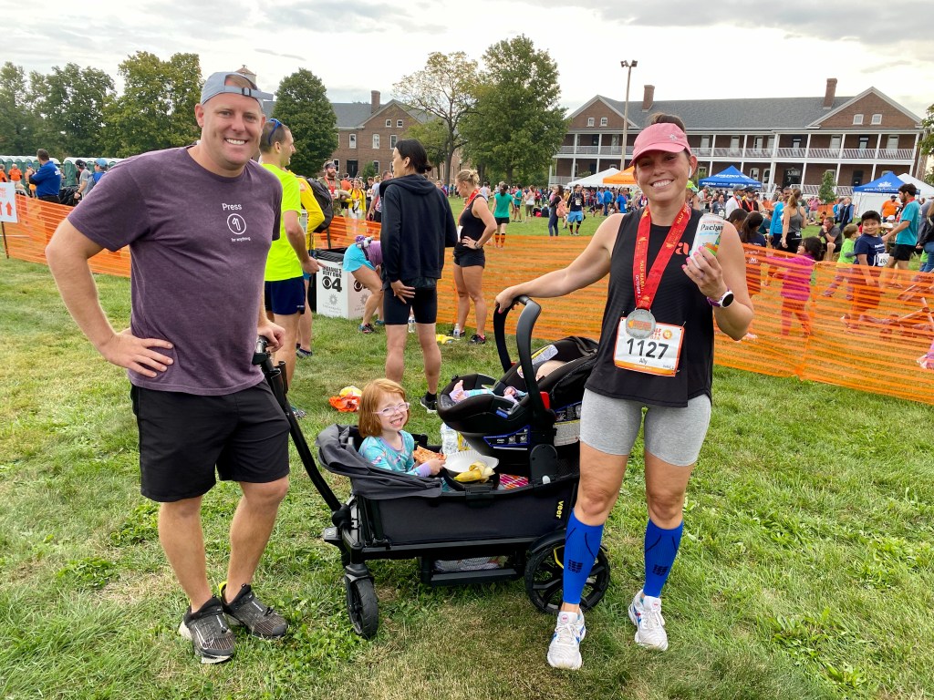 My husband, Zach, surprised me at the finish with our two girls (still in their PJs) and pumpkin donuts. That was certainly the highlight of this race. Sydney (our 4yo) saw my medal and asked, “Mommy, did you win?”. She wanted to eat all of my post race snacks, so I begrudgingly shared them with her. I hope there’s a day when she wants to run half marathons with me.