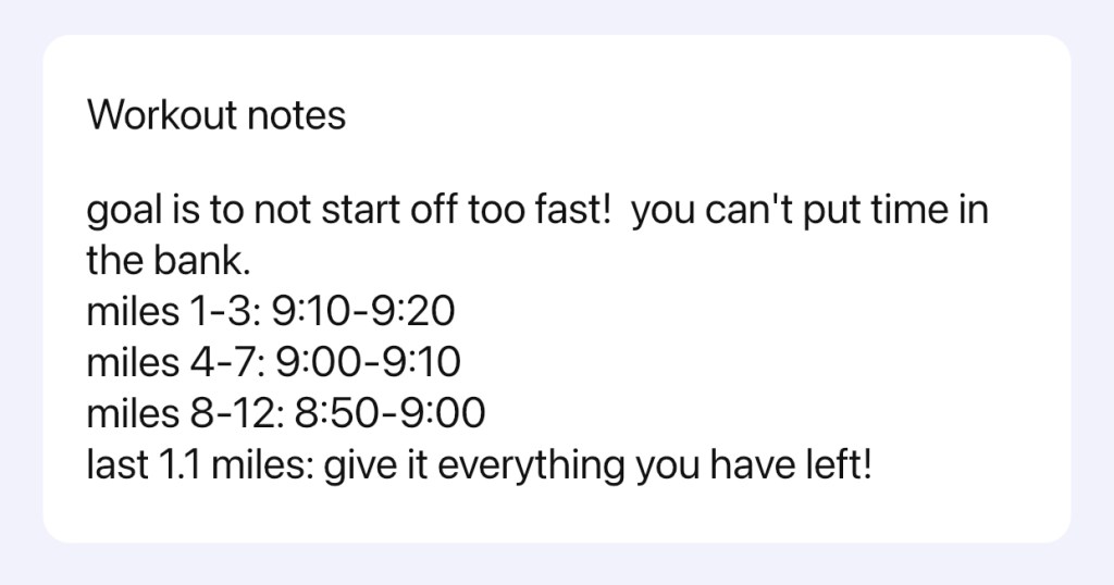 Rachel assigned the below splits for a race plan. I told her the times scared me. Also, I’ve never had a plan like this going into a race. She said, “You are capable of more than you think you are,” and that became my mantra.