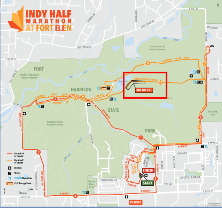 I’ve pretty much run all of the local Indy races, but the hills of Fort Ben have kept me away (even though I’ve run the Geist Half and the NYC Marathon – both a bit hilly). Don’t let this happen to you! I highly recommend running this race. It was a great event and beautiful course which distracted me from the hills (mostly). There’s really just the one big one that’s between miles 10 and 11. This year, there was a race within the race called “Kill The Hill”. There were timing mats at the bottom and top of the hill (about 400 meters). I did my best and felt like I was sprinting up the hill but was probably barely moving. 😂