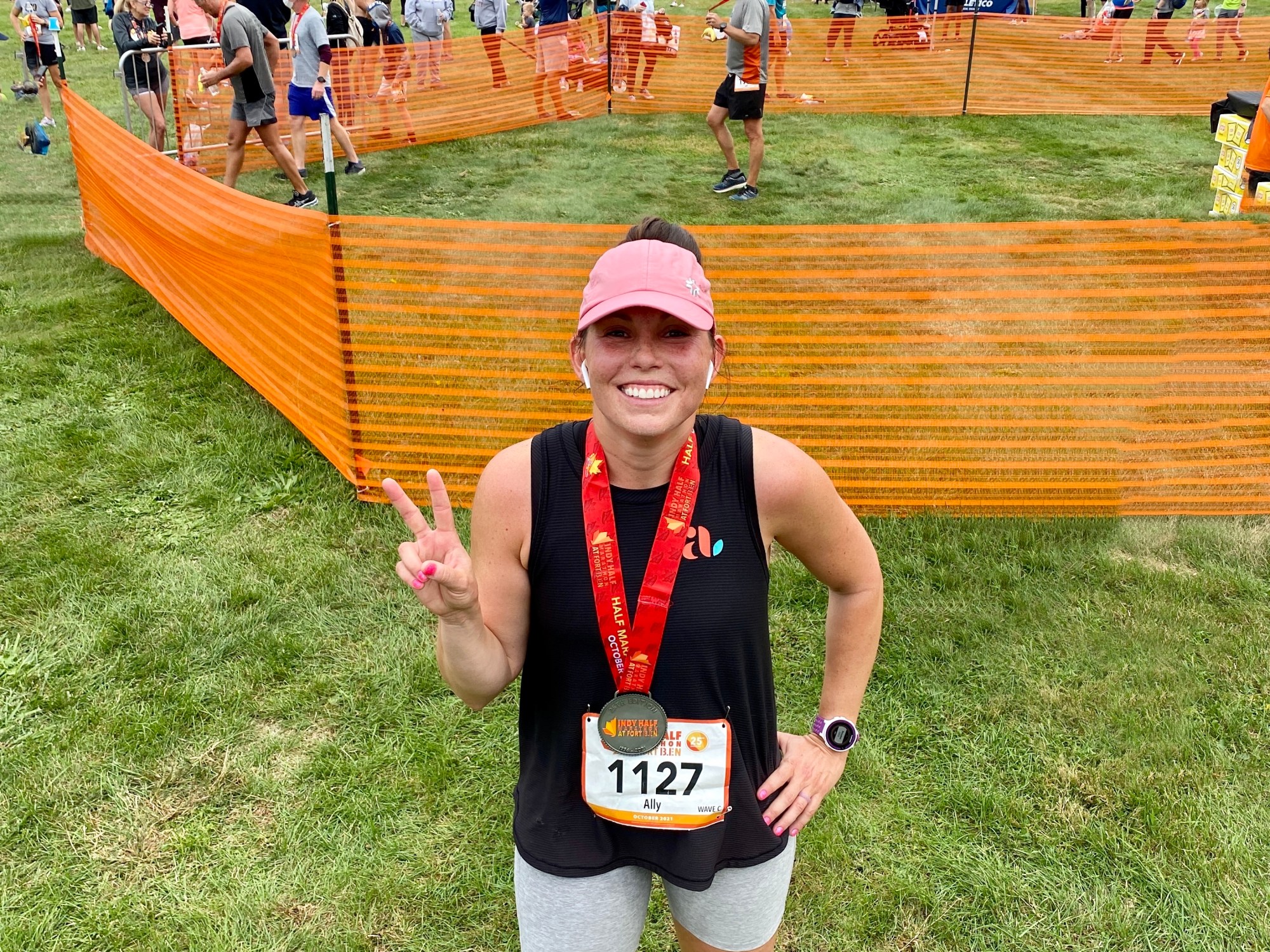 My husband, Zach, surprised me at the finish with our two girls (still in their PJs) and pumpkin donuts. That was certainly the highlight of this race. Sydney (our 4yo) saw my medal and asked, “Mommy, did you win?”. She wanted to eat all of my post race snacks, so I begrudgingly shared them with her. I hope there’s a day when she wants to run half marathons with me.